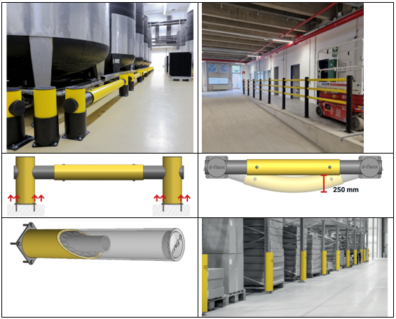 - Las barreras d-flexx están diseñadas para proteger los pisos de concreto, gracias a su tecnología de buffer pipe, que reduce la transferencia de energía al punto de anclaje.